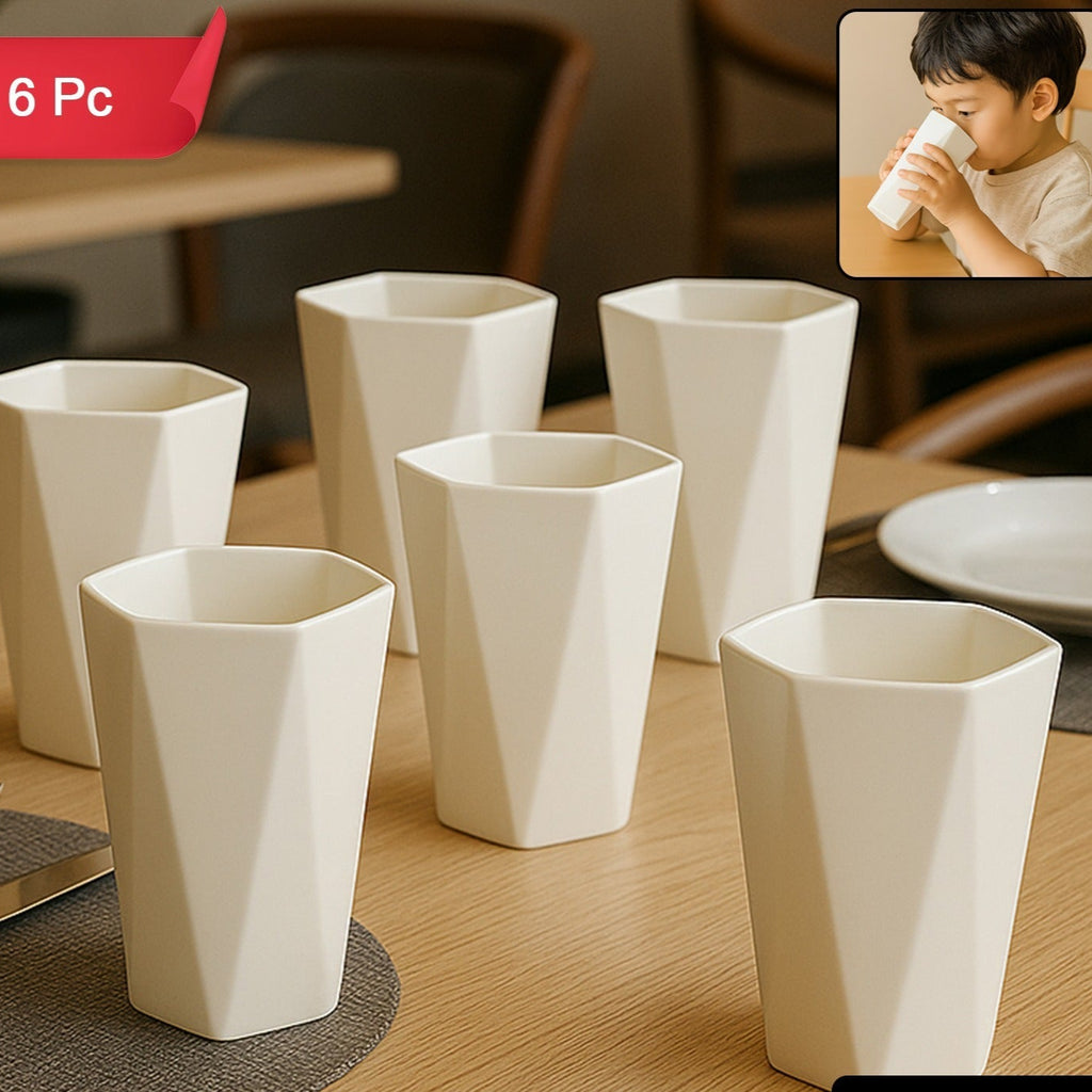 Serve beverages in style with this elegant hexagon-shaped drinking glass set, designed for modern homes. Made from premium quality unbreakable plastic, each glass features a distinctive geometric structure that provides a secure grip and a contemporary aesthetic. Lightweight yet durable, these tumblers are ideal for everyday use by both adults and kids. Whether you're serving water, juice, milk, or cold drinks, this set of 6 versatile cups is perfect for home, cafes, and casual gatherings. The sleek matte finish adds a touch of sophistication to your dining experience.